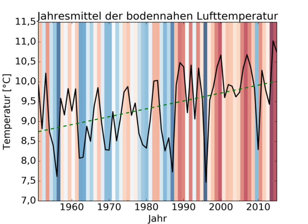 Doch auch für den Landkreis Anhalt-Bitterfeld lassen sich diese Veränderungen der klimatischen Bedingungen – und vor allem die Auswirkungen davon – beobachten. Zwischen den Zeiträumen 1951-1980 und 1986-2015 stieg die durchschnittliche Temperatur eines Jahres um 0,8 Grad Celsius an. Das lässt sich auch auf dieser Grafik erkennen.