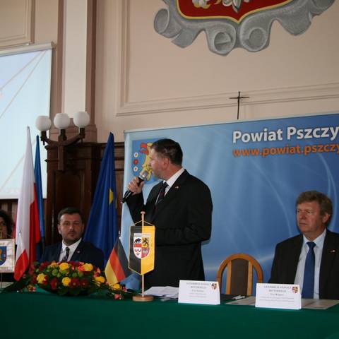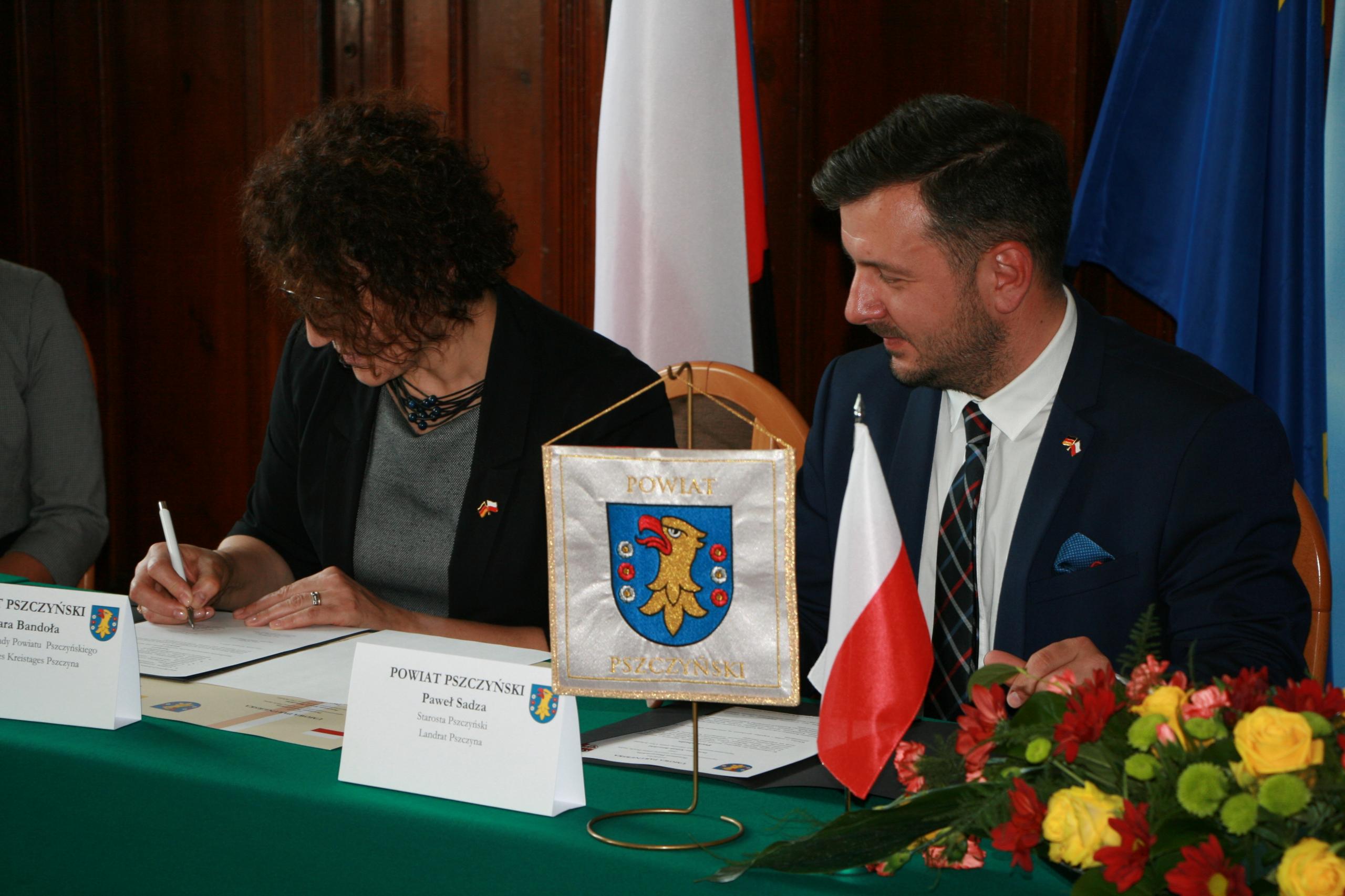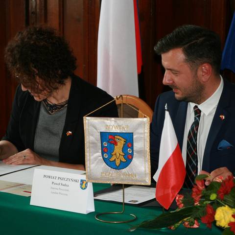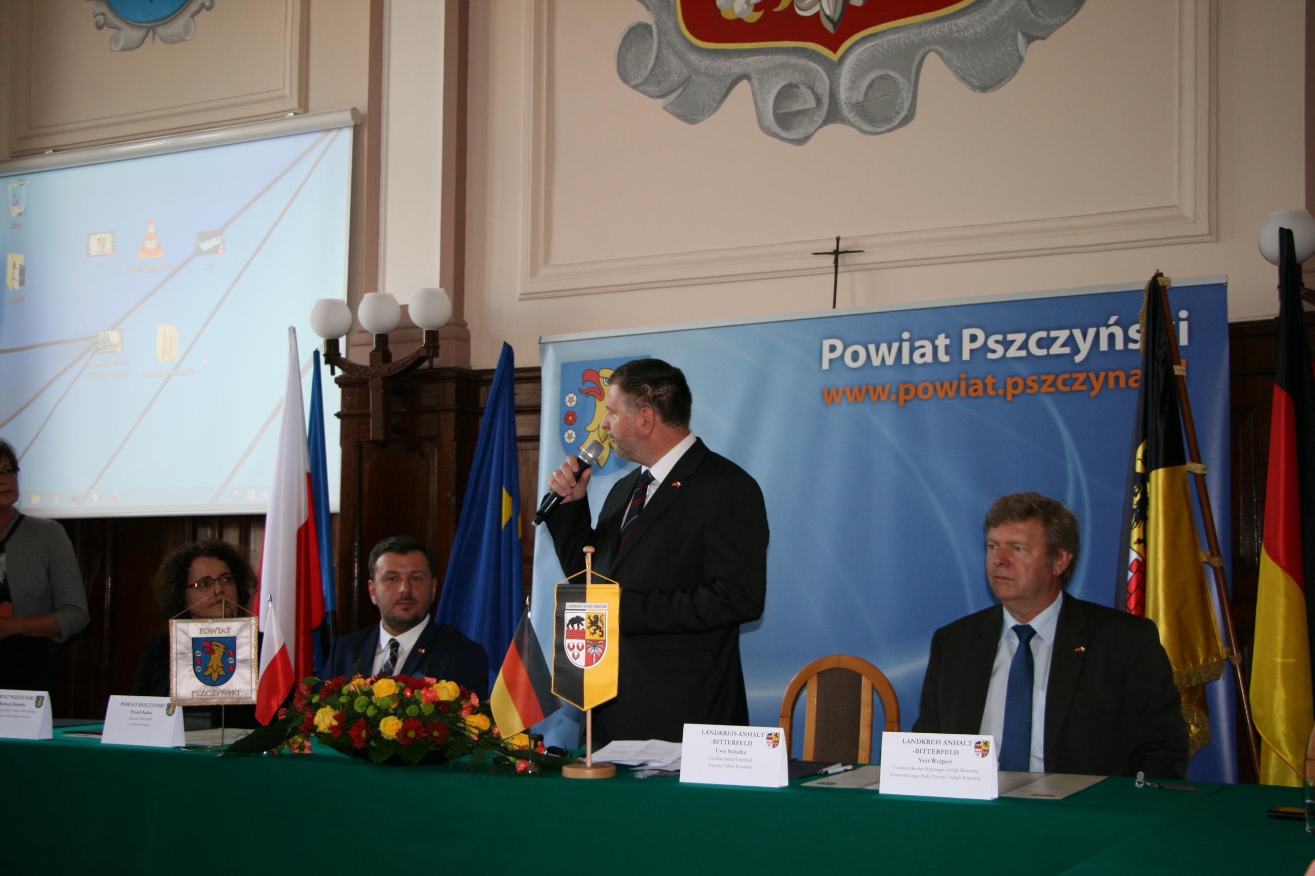 Unter Teilnahme zahlreicher anwesender Gäste, darunter Vertreter der Kommunalparlamente, der Landkreisverwaltungen Pszczyna und Anhalt-Bitterfeld, Unternehmer*innen, Schüler*innen und Pressevertreter, unterzeichneten die Landräte Pawel Sadza und Uwe Schulze die Partnerschaftsvereinbarung. Barbara Bandola und Veit Wolpert, Kreistagsvorsitzender, bestätigten dies mit ihrer Unterschrift. Beide Landräte betonten die Absicht zur guten und engen Zusammenarbeit. Besonders in Zeiten, da zwischen den Mitgliedsstaaten der europäischen Union Auseinandersetzungen und gegensätzliche politische Ansichten zu dominieren scheinen, freuten sich die Kommunalpolitiker über die bereits bis zum jetzigen Zeitpunkt entstandene freundschaftliche Annäherung beider Landkreise. Zur Bekräftigung und symbolischen Untermauerung des Abkommens tauschten beide Seiten ihre Landkreiswimpel aus.