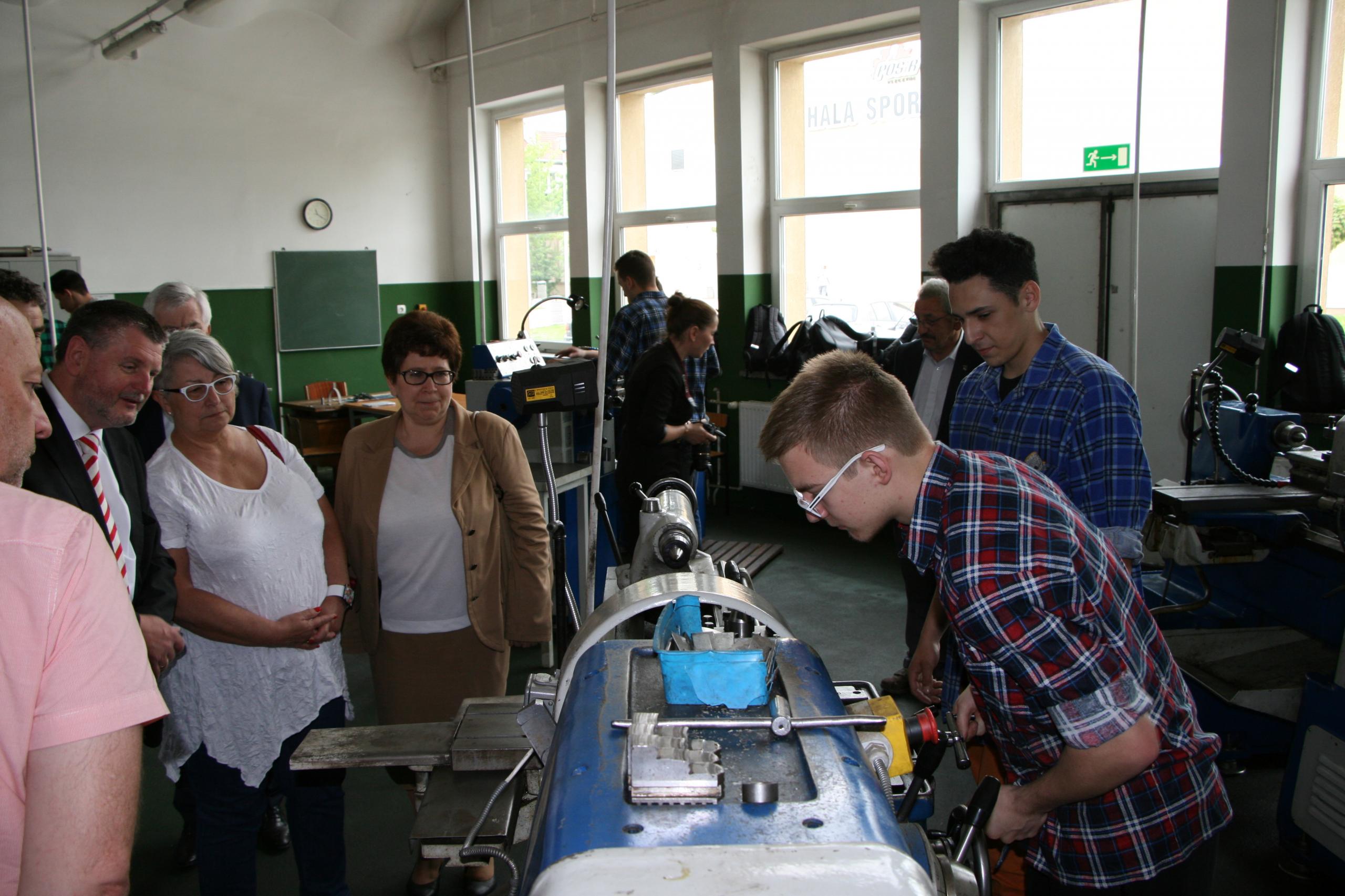 Über die Bildungssysteme in Deutschland und Polen kam man beim Besuch des Kreisschulzentrums 1 / Berufsbildende Schule ins Gespräch. Im 1. von insgesamt 3 Kreisschulzentren werden vor allem die technischen Berufe z.B. Maschinenbauer oder Mechatroniker ausgebildet. Die Gäste erhielten beim Rundgang durch die Werkstätten Gelegenheit, den Auszubildenden über die Schulter zu schauen. Vorallem beim gemeinsamen Gespräch mit dem Leitung des Bildungsbereiches des Landkreises erhielt die deutsche Delegation viele Informationen über die Bildungswege polnischer Schüler*innen, deren Wahlmöglichkeiten hinsichtlich Spezialisierungen nach der Grundschule und ihren Chancen auf dem Arbeitsmarkt. Hervorzuheben ist, dass die Arbeitslosenquote im Powiat Pszczyna mit 4,5 % außerordentlich niedrig liegt. Das entspricht rund 2.200 arbeitslosen Menschen, wovon rund die Hälfte jünger als 30 Jahre ist. Sicher auch ein Grund dafür, warum in Polen (wie auch in Deutschland) die jungen Menschen den Landkreis verlassen, um sich in größeren Städten wie z.B. Katowice anzusiedeln. Die Arbeitsbedingungen junger Menschen, die Chance auf Austausch im Bildungssektor, die Fachkräftegewinnung im ländlichen Raum und der Austausch von Auszubildenden zwischen Anhalt-Bitterfeld und Pszczyna werden die Themen der zukünftigen intensiveren Zusammenarbeit sein. Darüber herrschte auf beiden Seiten Einigkeit.