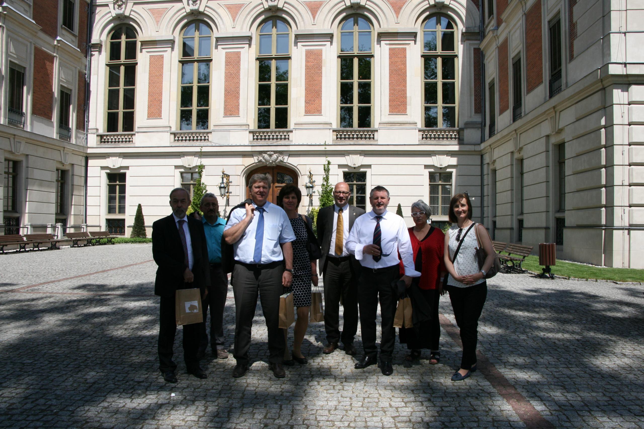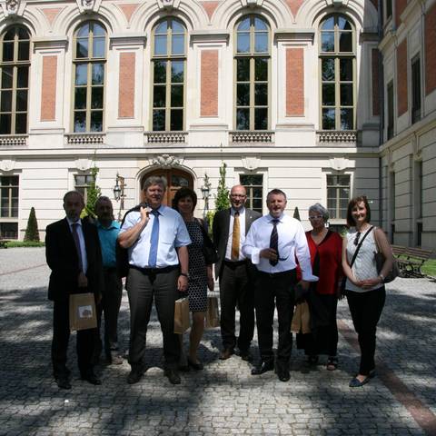 Auf Einladung von Herrn Landrat Sadza und in Begleitung des Kreistagsvorsitzenden, des Vorsitzenden des Kreistagsausschusses für Kultur und Tourismus, Ronald Mormann, sowie der Fraktionsvorsitzenden von CDU/FDP, Bernhard Northoff, sowie der Fraktion Die.Linke, Bettina Kutz, des Dezernenten für Sicherheit, Ordnung und Kommunales, Bernhard Böddeker, der Koordinatorin für Europa-Arbeit im Landkreis, Bianca Laukat, Unternehmer Thomas Vetter sowie Anja Krämer, Gleichstellungsbeauftragte und in Vertretung des pers. Referenten, begab sich Landrat Uwe Schulze auf Entdeckungsreise in der Partnerschaftsregion. Den Anfang machte ein gemeinsamer Spaziergang von Gastgebern und Gästen durch die Wisentzucht in Pszczyna, die sich seit 150 Jahren nach einem ersten Tausch von Zuchttieren zwischen dem Russischen Zaren Alexander II. und Johann Heinrich XI. von Hochberg, Herzog von Pless (Pszczyna) etabliert hat. Auge in Auge stand man den Tieren gegenüber und erfuhr im Infozentrum alles Wissenswerte über das Leben und die Zucht der derzeit 80 dort lebenden Wisente und der anderen Wildtiere. Der Vorsitzende der Agentur für Entwicklung und Förderung Pszczyna, Jacek Patyk und der Direktor der Wisentfarm, Gregorz Czembor, führten fachkundig über das 10 Hektar große Gelände. Dass die Landesgeschichte Pszczynas eng verbunden mit der deutschen, böhmischen und österreichischen Geschichte ist, darüber informierte Edelgarda Foltyn die kleine Reisegesellschaft im Schlossmuseum Pszczyna, das im übrigen zur Zeit unseres Aufenthaltes sein 70jähriges Bestehen mit einem umfangreichen Fest- und Vortragsprogramm beging. Daran beteiligt war u.a. Michael Schuster, Geschäftsführer der Köthen Kultur & Marketing GmbH, der über Geschichte und Zukunft des Köthener Schlosses am 13. Mai in Pszczyna berichtete. Das beide Fürstenhäuser im 18. und 19. Jh. miteinander verbunden waren, darüber wurde bereits mehrmals berichtet. Das äußerst eindrucksvolle, prächtige Schloss Pszczyna ist sehr gut erhalten, da es trotz kriegerischer Auseinandersetzungen von Bränden, Plünderungen oder Bombardierungen verschont blieb. Etwa 70 % der Ausstattungsgegenstände und des Mobiliars im Schloss ist im Original erhalten geblieben und vermittelt dem Besucher auf diese Weise einen sehr lebendigen Eindruck von der besonderen Atmosphäre dieser herrschaftlichen Residenz. Eine kleine Besonderheit: bereits zum Ende des 19. / Beginn des 20. Jahrhunderts war das Schloss Pszczyna eines der ersten, das seinem zeitweisen kaiserlichen Bewohner, Wilhelm II., die Annehmlichkeiten eines eigenen Telefonanschlusses bot.